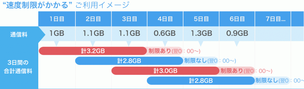 ※ 速度制限は直近3日間のデータ通信量が3GBを超過した日の翌日0:00 (当日24:00) から適用となります。超過した当日時点では制限はかかりません。