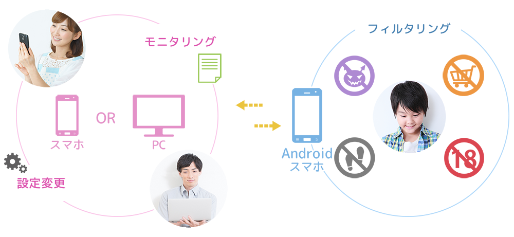 ■主要機能:お子様等のスマートフォンの使用状況をモニタリングし、それぞれの状況に合わせた使用時間の調整やサイト/アプリケーションの制限等が可能となります。